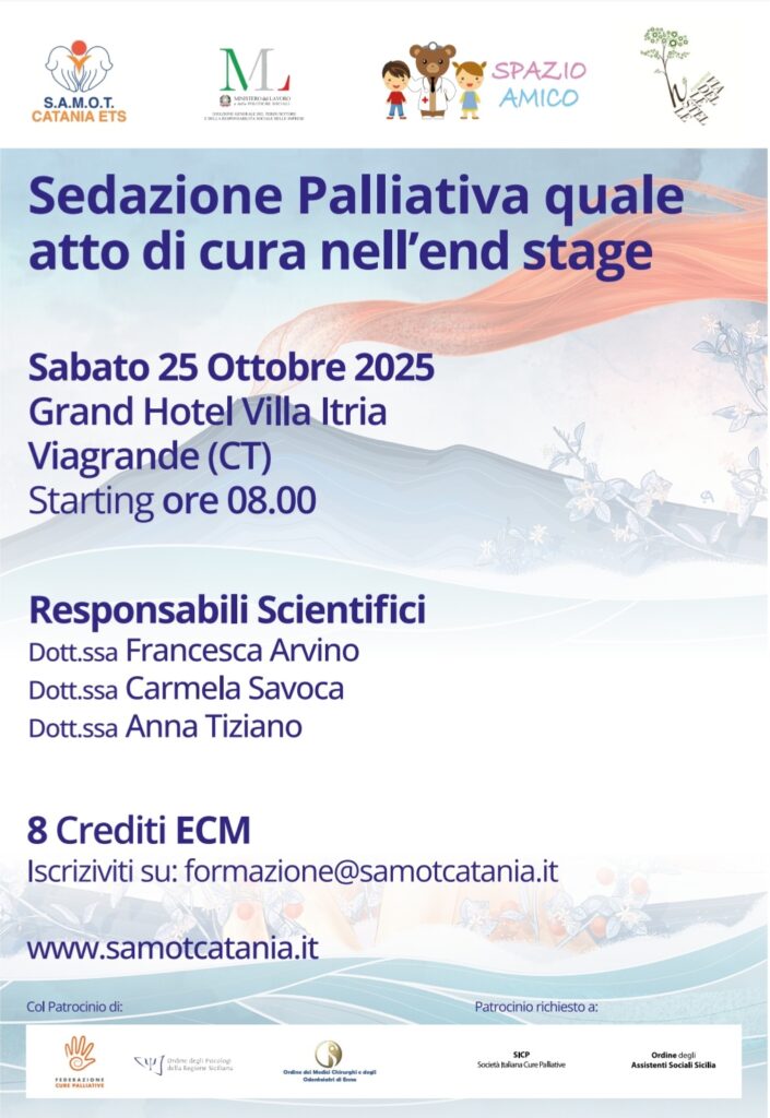 L’accompagnamento al fine vita richiede professionalità e alta formazione. In questo ambito Samot Catania ETS (Società per l’Assistenza al Malato Oncologico Terminale) organizza un corso Ecm dal titolo “Sedazione palliativa quale atto di cura nell’end stage”, in programma sabato 25 ottobre 2025 a partire dalle ore 8 al Grand Hotel Villa Itria di Viagrande (Ct) in via Antonino Aniante 3.